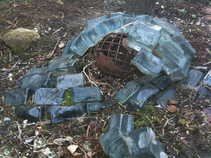 This is a sculpture made of cast glass bricks I made at the Pilchuck Glass School in the 1990’s. It sat in the woods near my parents woods for about 20 years until they moved 5 years ago. Now it lives in my backyard in Brooklyn.