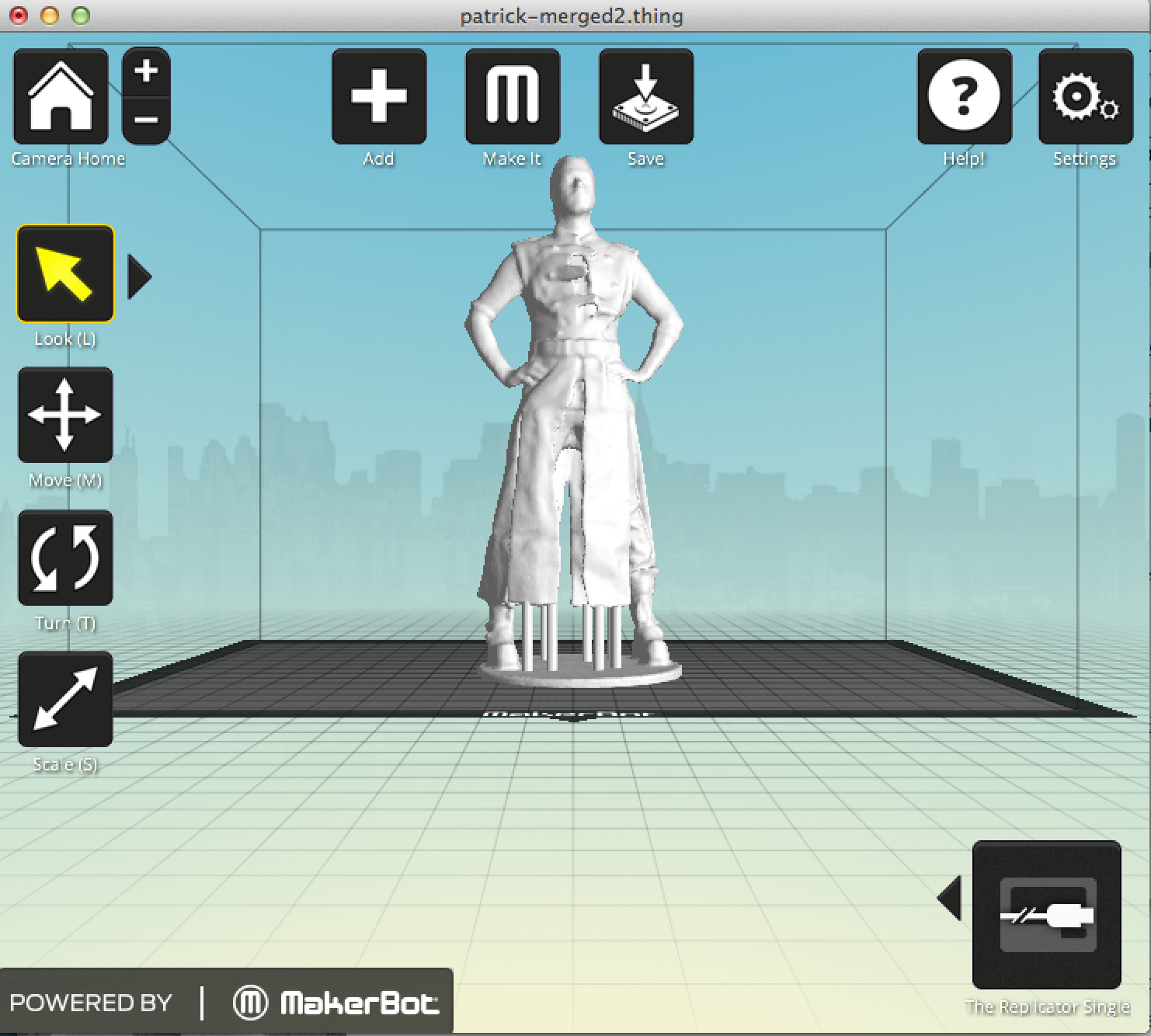 Bre Pettis from Makerbot tweeted a link earlier today- about using a helper disk object to help anchor object to the build plate or manually generate selective suports in their Makerware software. I was previously unaware of the helper disk object and though it was a little time consuming to disproportionately resize and place supports manually for a print, it was quite doable. Once you have one sized support, it was fairly quick to copy and paste, move it and adjust the height. Read the full post on helper disks here. Here’s my application of them on a print which is otherwise a nightmare to clean support off of: