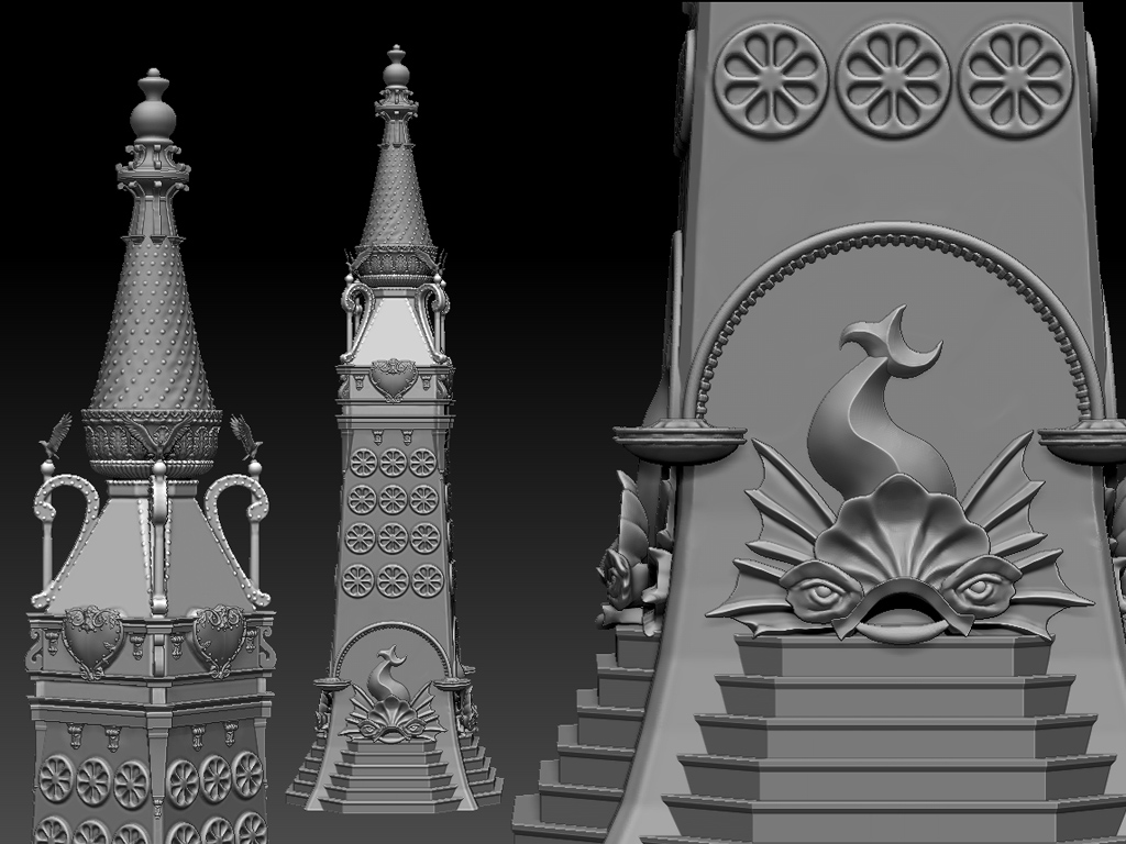 My first model of the Electric Tower was designed in SketchUp and lacked the ornate detail of the original Luna Park architecture. that’s why I chose Zbrush as the software to model Luna Park with. The software allows for the kind of detail the original park had. Furthermore, the tower that is currently featured in the Thompson & Dundy’s Luna Park: 3D Printed by the Great Fredini installation at the Coney Island Museum (and coming to World Makerfaire New York this weekend) turned out to be the wrong scale. I’ve been hemming and hawing about remodeling it with better detail, but its finally ready for 3D printing. The tower changed from year to year so I’ve opted to create one of the most ornate versions of it that existed circa 1907 with the dolphin fountains at the base. This model is likely to take over a month to print as it needs to be approximately 7′ tall- I’ll have to cut it up into blocks that will fit on my printers and then assemble them.