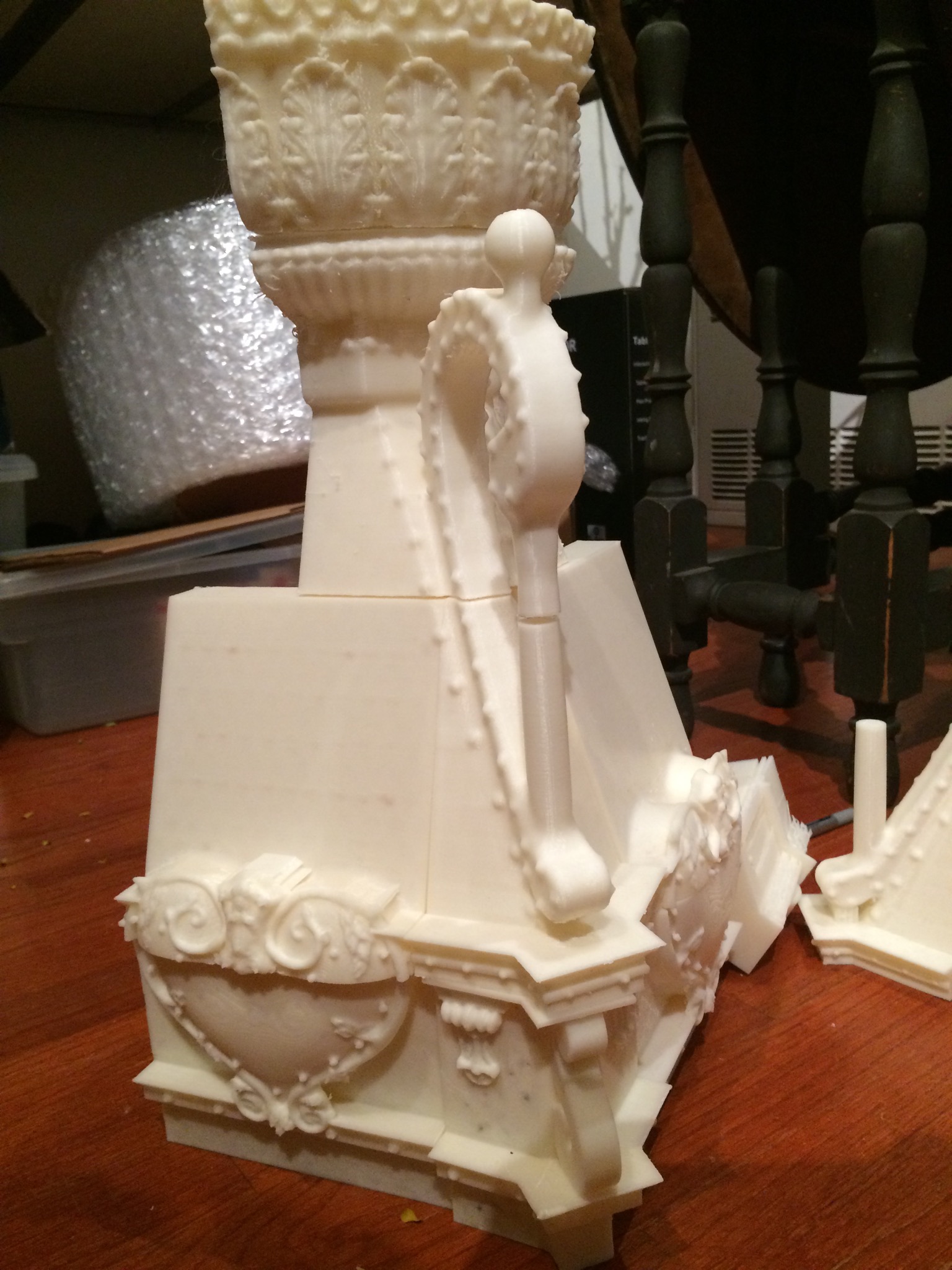 The original Electric Tower in my exhibit Thompson & Dundy’s Luna Park: 3D Printed at the Coney Island Museum was out of scale with the rest of the model and lacked a lot of the ornate detailing of the later pieces. I spent a long time working on looking at historic photos and getting the details just right on the 3D model before beginning printing. It’s been printing in pieces for almost two months now and is finally almost ready for assembly! It will be taller than me- I can’t wait to see it all together. Here’s a glimpse of what the top assembly will look like!