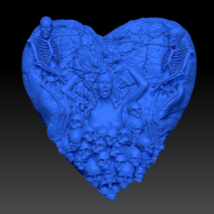 I 3D scanned Kembra Pfahler of the Voluptuous Horror of Karen Black this spring and have been working on a 3D portrait of her off and on for a while now. My initial intent had been to do something with many arms, reminiscent of the Hindu goddess Kali, an image inspired by her love of blue body paint, but this imagery was not at all working for Kembra. She felt Kali was too obvious and already done by Nina Hagen. So my scans of her have been languishing and waiting for inspiration. I had included her in some sketches for the Gates of Hell that I’m working on, but had nothing yet… until last night when this came together. Its 3D printing away now on my Jetguy Big Boy printer for another 20 hours, but I’m looking forward to seeing how it comes out!