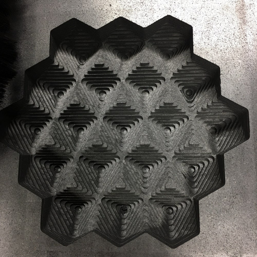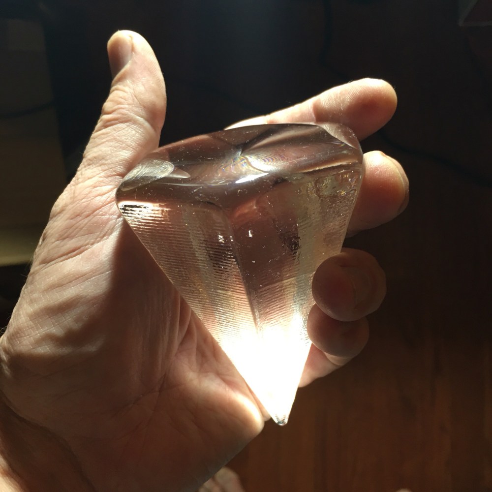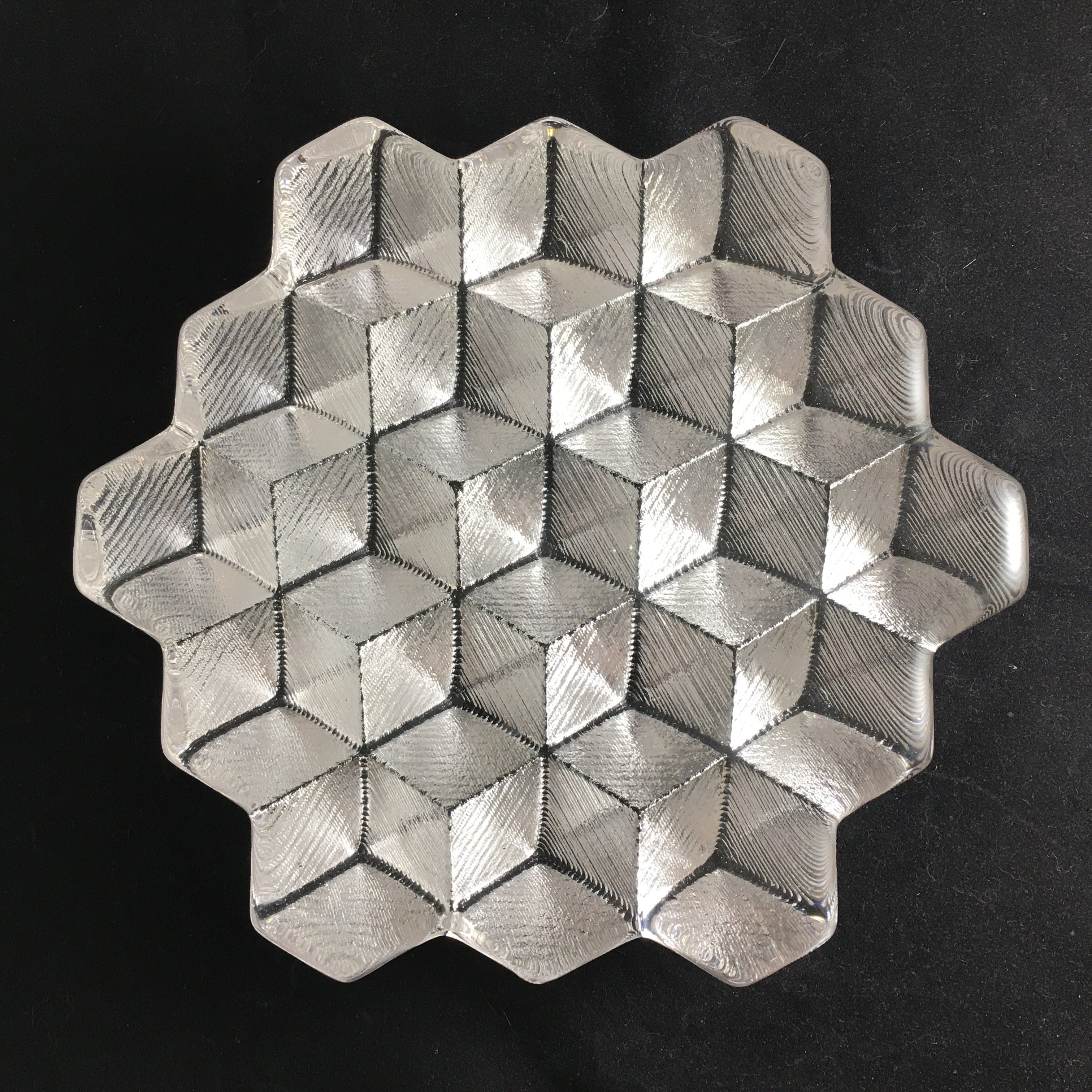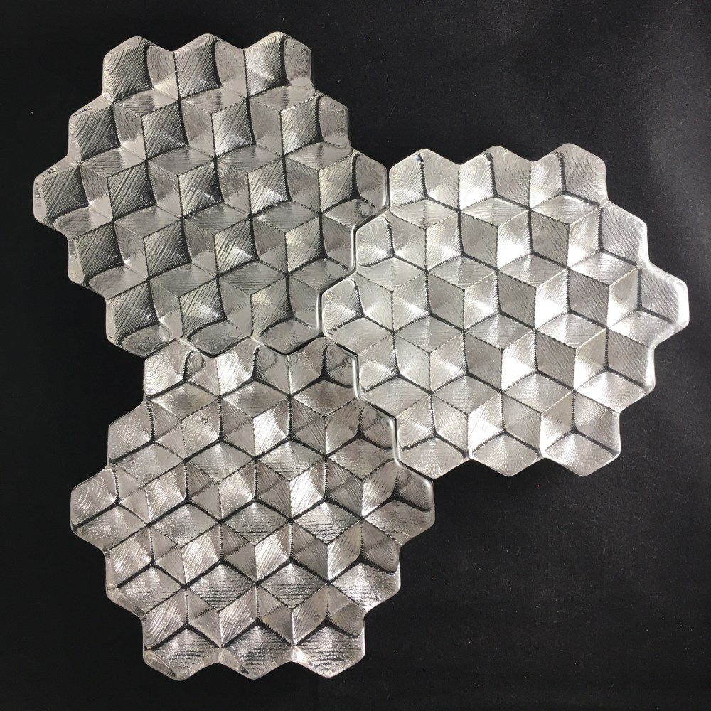 With a clean and simple design, these new geometric tiles channel the 1980’s era video game Qbert, Islamic mosaics, and leverage the material’s clarity and sparkle. I love the simplicity and the illusory way we see through the smooth top surface to see the relief texture on the backside. I am thinking this will become a set of tabletop design objects, with 6″,9″ and 11″ sizes that interlock. However, I am almost more excited to think of them as architectural tile. How cool would it be to have a wall made of these, or have them as accents embedded in concrete?