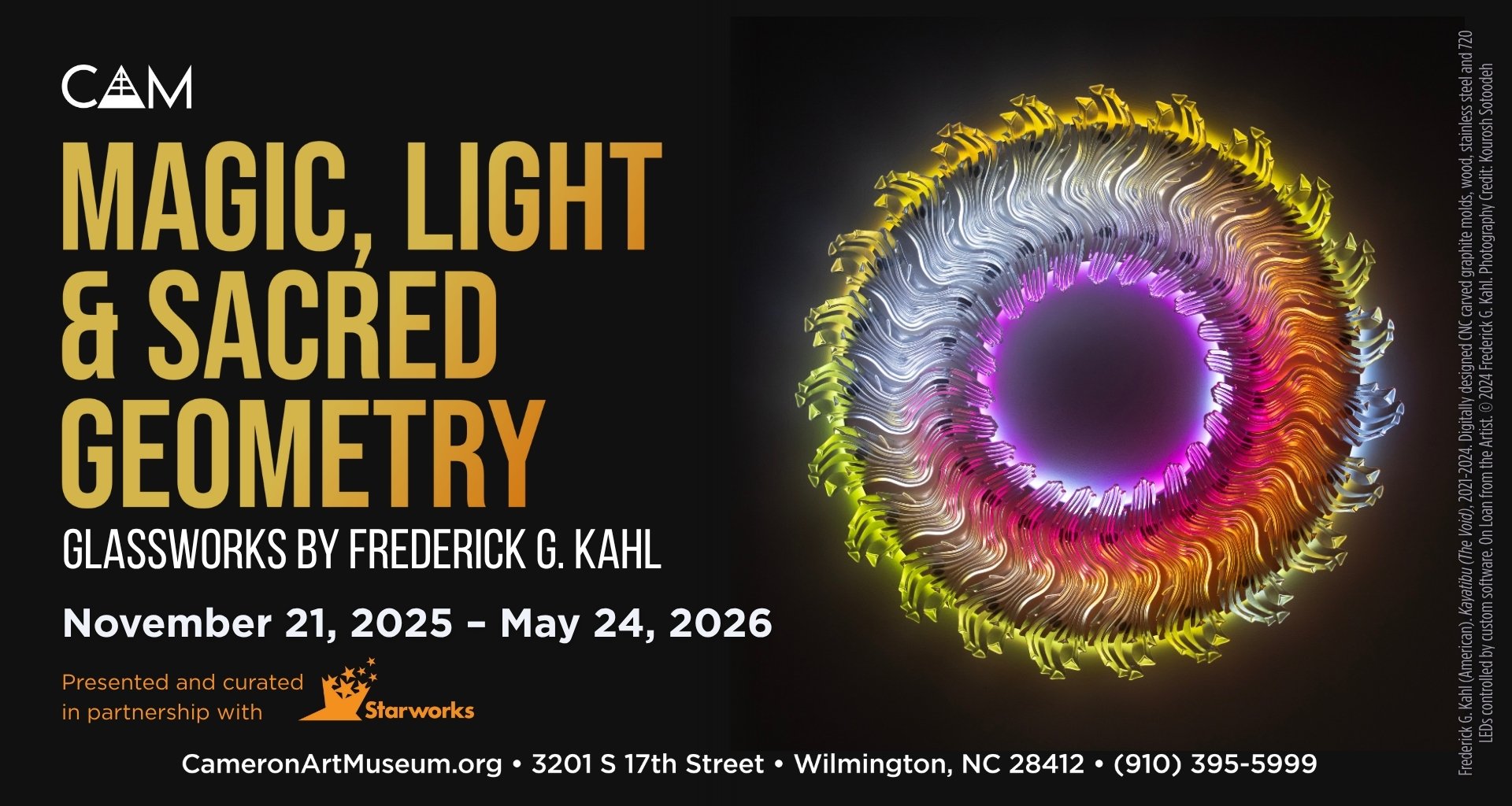 Magic, Light and Sacred Geometry: Glassworks by Frederick G. Kahl is the culmination of the artist’s decade-long inquiry into the immersive and meditative quality of light. This exhibition features glass works as well as drawings. Magic, play and a sense of mystery have informed the multi-media artist’s work over his varied career. Also known as “the Great Fredini,” Kahl’s artistic experiences have included visual and stage illusions, sideshow performances including yogic feats of sword swallowing, and 3D scanned and printed portrait sculptures. His current focus of sacred geometries to create meditational experiences informs this exhibition. Presented and curated with partner Starworks, a non-profit art studio with galleries in Star, NC, this exhibition features Kahl’s work in conjunction with his summer 2025 artist residency at Starworks.